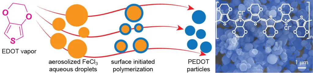 Their novel method starts with small aerosolized droplets that are made even smaller by heating them to evaporate some of the water. These tiny droplets then serve as templates for nanoparticles. The template droplets aren’t pure water. They contain a salt that reacts with a vaporized monomer, causing the material to stick to the surface of the droplets to form conducting polymer particles.